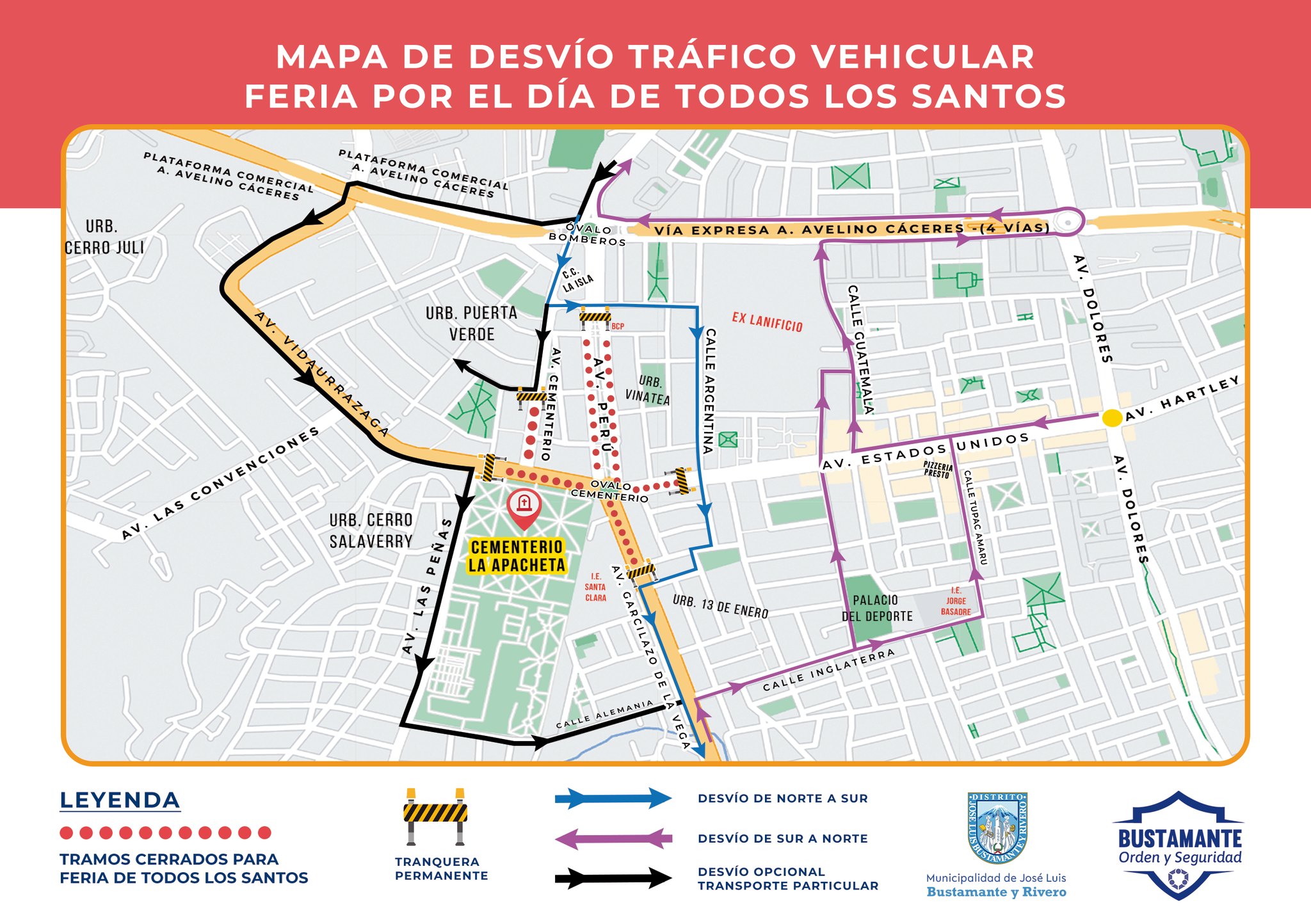 Del 31 de octubre al 2 de noviembre, el tránsito se moverá más lento que procesión: aquí el mapa de desvíos. Conoce los desvíos y restricciones por la Feria de Todos los Santos 2025 cerca del Cementerio La Apacheta. Evita el tráfico y disfruta la tradición. Se viene la Feria de Todos los Santos 2025 y, como buen arequipeño prevenido, más te vale revisar el mapa de desvíos antes de salir o podrías quedar atrapado en el tráfico más espiritual del año. La Municipalidad de Bustamante y Rivero informó que, desde el 31 de octubre hasta el 2 de noviembre, los alrededores del Cementerio General La Apacheta estarán ocupados por la tradicional feria donde se venderán flores, coronas, velas, panes, roscas y —cómo no— un rocoto relleno para el alma. 🌶️💐 Durante esos días, varias calles estarán cerradas al tránsito vehicular, y los desvíos buscan evitar el caos en las avenidas Cementerio, Estados Unidos, Perú y Garcilaso de la Vega. Así que si tu GPS empieza a volverse loco, no lo insultes: es culpa del espíritu festivo, no del WiFi. La feria arrancará temprano, desde las 6 de la mañana, y promete ser una mezcla de tradición, comercio y reencuentro familiar. Además, los puestos contarán con control municipal para mantener el orden, limpieza y seguridad durante la jornada. Así que si planeas visitar a tus seres queridos o simplemente quieres darte una vuelta por los antojitos, anda con tiempo, paciencia y sin apuro. El cielo puede esperar, pero el tráfico no.
